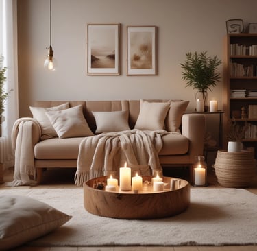 Dekorative Elemente wie Pflanzen, Bücher, Fotos oder kleine Dekofiguren verleihen deiner Wohlfühlecke Persönlichkeit. Ein Pflanzenkübel, ein schönes Tablett oder ein Duftkerzen-Arrangement runden die Atmosphäre ab – so wird aus einem einfachen Sofa ein echter Wohlfühlort.