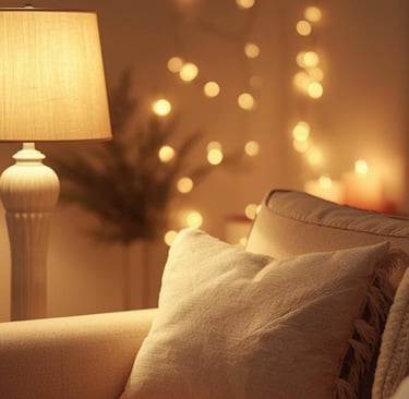 Sanftes Licht macht jede Wohlfühlecke noch einladender. Ein kleiner Steh- oder Tischlampenschirm, Kerzen oder eine Lichterkette hinter dem Sofa sorgen für warmes, indirektes Licht. So wirkt dein Rückzugsort gleich gemütlicher und entspannter.