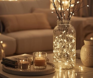 Eine Lichterkette ist mehr als nur Deko – sie ist Stimmung pur. Ob um den Spiegel, im Glas oder locker über dem Sofa: Sanftes, warmweißes Licht bringt sofort Ruhe und Geborgenheit in den Raum.