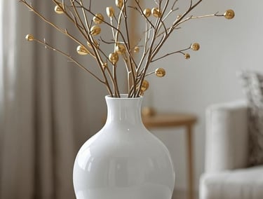 Minimalistische Deko lebt von klaren Linien und gezielten Blickfängen. Weiße Vasen aus Keramik oder Glas werden mit goldenen Zweigen, Kugeln oder feinen Ornamenten zu eleganten Hinguckern. Achte darauf, nicht zu viel zu kombinieren – ein einzelnes, bewusst platziertes Objekt wirkt oft stärker als ein volles Arrangement.