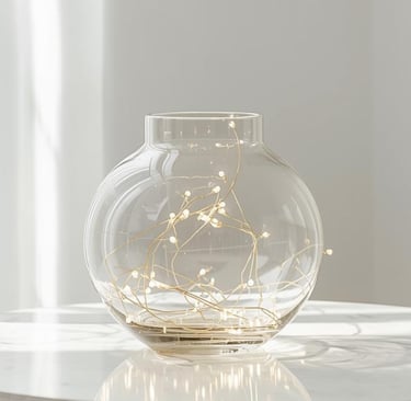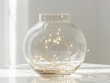 Sanftes Licht bringt Struktur und Tiefe in die Winterdekoration. Eine Micro-Lichterkette in Warmweiß, locker in einer Glasvase oder über einem Regal arrangiert, lässt die goldenen Elemente besonders schön schimmern. Ergänze das Ganze mit goldfarbenen Teelichthaltern oder einem kleinen LED-Lichtobjekt für ein dezentes Funkeln.