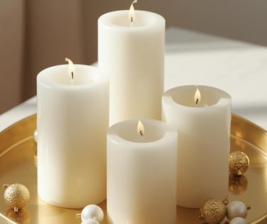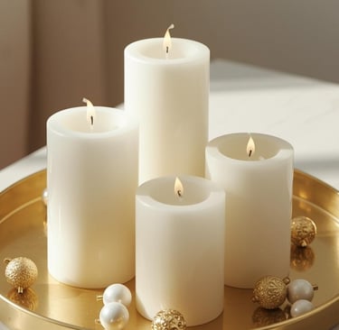 🤍 1. Weiß-goldene Kerzenarrangements – sanftes Licht mit Struktur