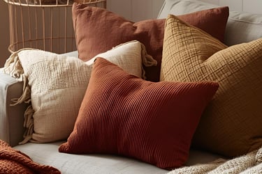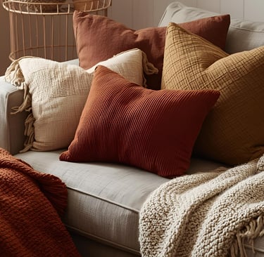Kissen gehören zu den einfachsten Möglichkeiten, Gemütlichkeit zu schaffen. Sie bringen Farbe, Struktur und Weichheit auf Sofa oder Sessel. Besonders schön wirkt eine Kombination aus verschiedenen Größen und Stoffen – Leinen, Cord, Strick oder Samt. Warme Töne wie Beige, Rost, Senf oder Oliv passen wunderbar in den Herbst und Winter.